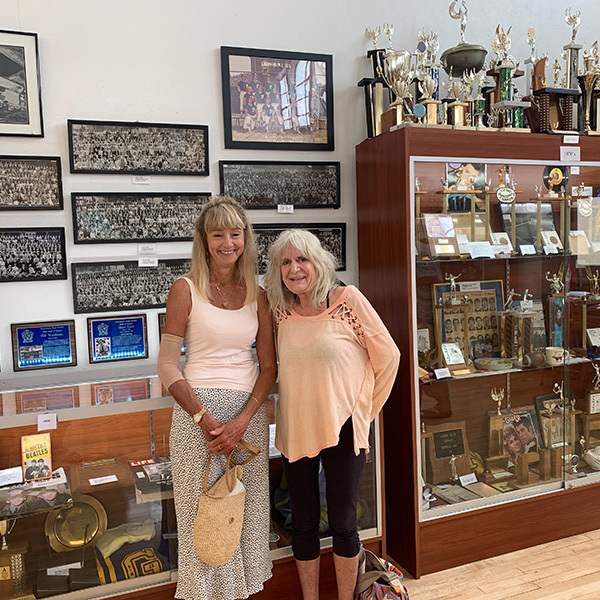 August 2021 Class of 1970 Terry Kennefick and Alexina Wempren in front of 1970s showcases
