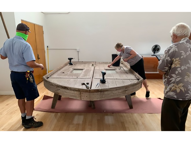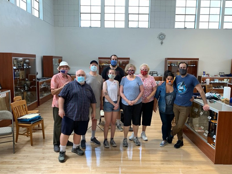 August 2020 Worker Bees, left to right: Bill Woolman, Class of 1962; Paul Miller, Alumni Director, Class of 1966; Jerry Botts, Museum Volunteer, Class of 1970, and his granddaughter Serena Thornton, our nephew Matt Vellone, Lynn and Connie; niece and nephew Kijan and Kyle Baer