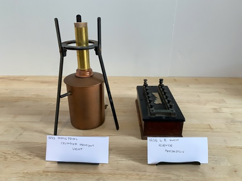 1923 Industrial Cylinder Pendant Light and 1928 L.E. Knott Science Apparatus