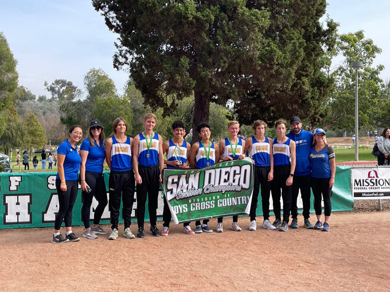 “The boys team won the Grossmont Hills League and Grossmont Conference title in dominant fashion with Russell Blakely placing 1st, Ian Rosen 2nd, Kei Okura 4th, Josh Edwards 5th, and Mason Coyle 16th.