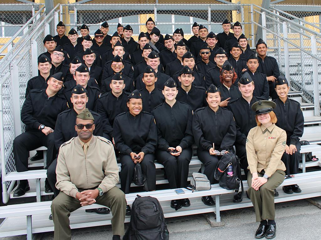 Chief Warrant Officer Max Velasquez shares that “50 of our Grossmont High School NJROTC cadets visited the Marine Corps Recruit Depot on March 10, 2023. It was a day filled with pomp & circumstance with the cadets observing an official graduation ceremony of over 200 newly enlisted Marines, as well as going on a tour of the Marine Corp Museum, observing displays and listening to lectures covering the history of the Marines from the 19th century to present day.