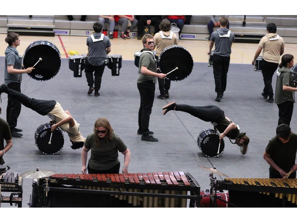 Similar to Winter Guard is Winter Line, with the major exception that the music is live. With backing from a frontline ensemble of marimbas, vibraphones and auxiliary percussion, performers on bass drums, snare drums and tenor drums (quad toms) perform dance moves and gymnastics while playing the instruments! This year’s exciting show, The Idol, took our performers on a competition tour as far north as Fontana!”