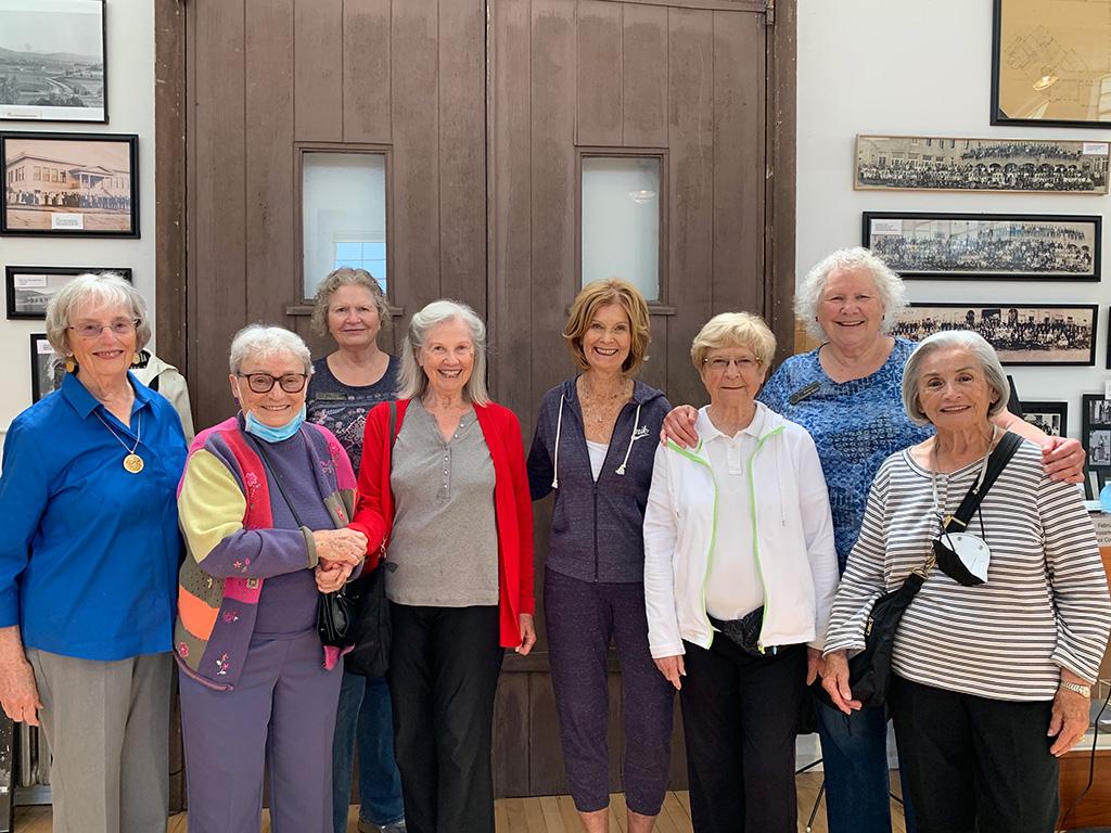 In front of the doors, we display two mannequins with girls uniforms, a white middy blouse with a black sash and a white blouse with black shorts and underpants, both in bloomer style, which belonged to Mary Peace Romig Holloway, Class of 1933. Our friends at the La Mesa Historical Society received them as a donation and in 2010 gave them to us to display.