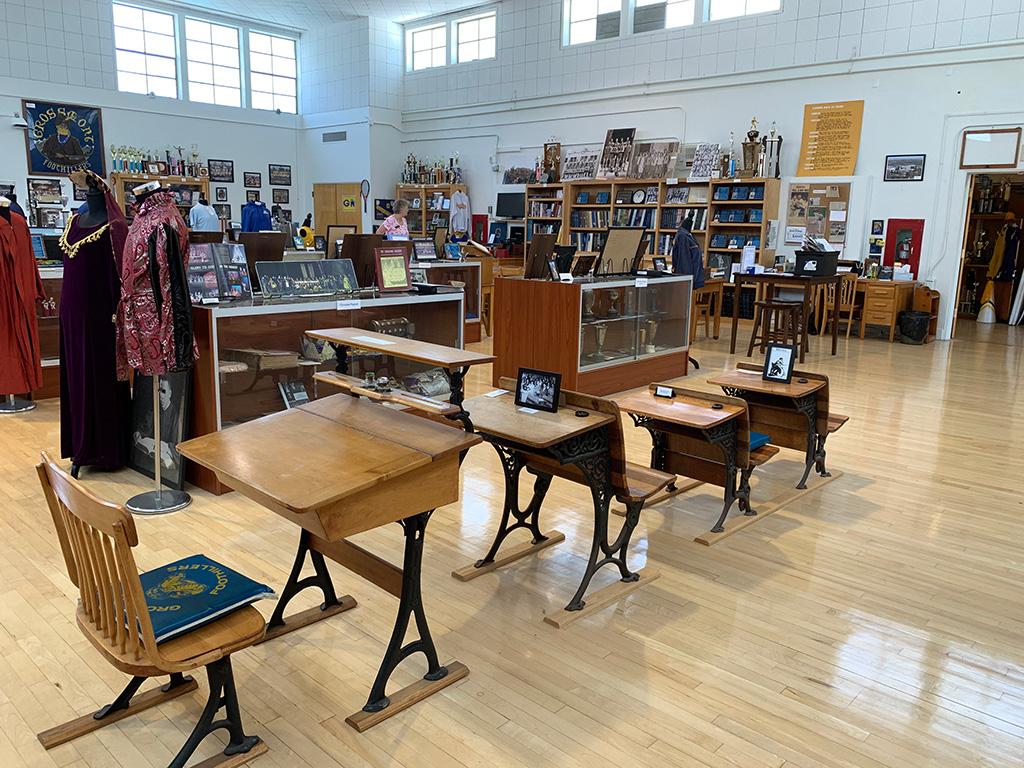 Other items from the original school on display include a section of the radiator heaters that heated the original school as well as the Old Main, the 1937 rear classroom building used by GHS English students until 2006; the original upstairs school bell; the original school seal stamp, which was used to stamp diplomas in the 1920s. In the modern high school office, the original clock welcomes students, staff, and parents to the lobby; it hurried students to classes as it was used to control the bells for several decades.