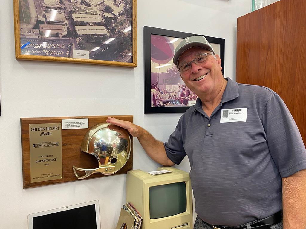 Of course, we did. But the story continues. Rick dropped it off at the GUHSD Superintendent’s office, where Denise Broadfoot works. The plaque is inscribed “The Big Hit” 1970 Grossmont High School. Denise Broadfoot’s husband is Bruce Broadfoot, Class of 1972, whose best friend was Vernon Lindvedt, the football player honored with the trophy. Vernon wanted the museum to have it.