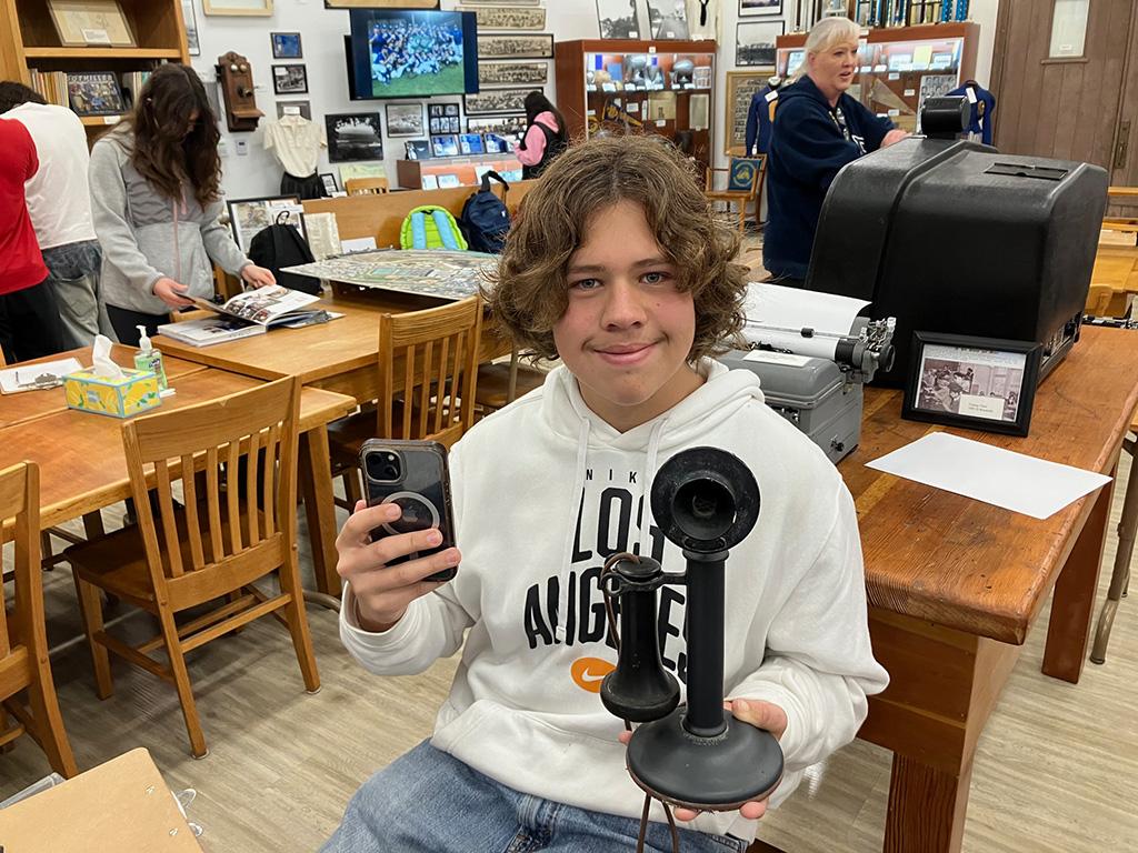 We also have a telephone switchboard used in the high school office and then the district office along with several telephones: a 1902 wall phone and a 1915 candlestick phone that would have required a switchboard operator to complete a call. We also have a 1970s rotary telephone. The students are fascinated by them.