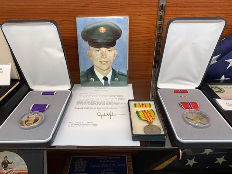 Glenn Luhnow, Class of 1963, Donated by Sandra Luhnow: Glenn’s Purple Heart, Bronze Star, Army Photograph, Vietnam Service Medal, and the Letter Notifying Sandra of His Death in Vietnam on October 14, 1967. (Glenn is one of 11 Foothillers killed in Vietnam.)