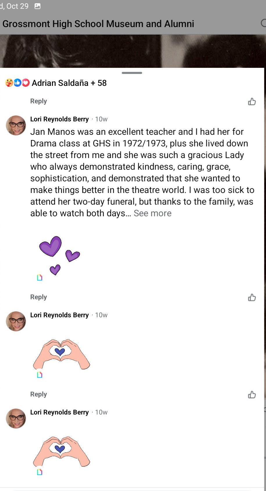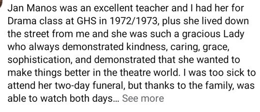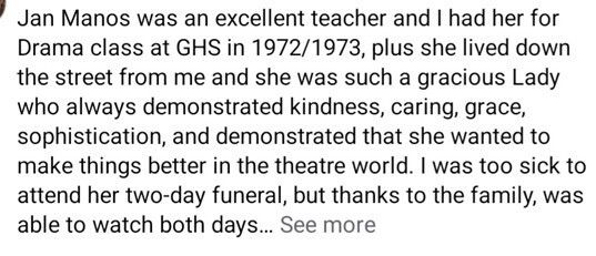 Also, thanks to Judi Patterson for sharing the passing of Jan Manos, a drama teacher, who substituted for Audrey Seidel in 1973 when she was pregnant. (Judi and her daughter Shari attended Jan’s 94th birthday party.)